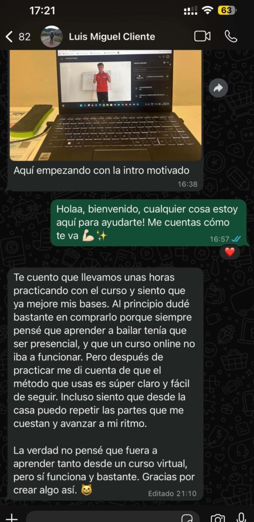 Es un programa de entrenamiento online con acceso inmediato donde aprenderás a bailar salsa de forma clara y progresiva. Incluye clases paso a paso, ejercicios prácticos y material guiado que podrás aplicar desde el primer día para mejorar tu coordinación, tu seguridad y tu forma de bailar, incluso si hoy sientes que sabes poco o nada.